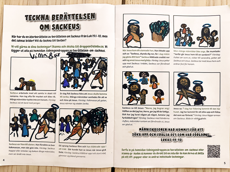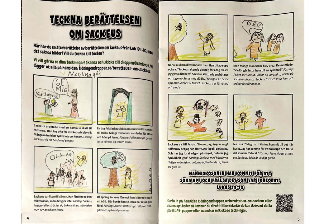 Här kan du ladda ner det som var i tidningen och skriva ut på ett A4-papper: Teckna berättelsen om Sackeus.